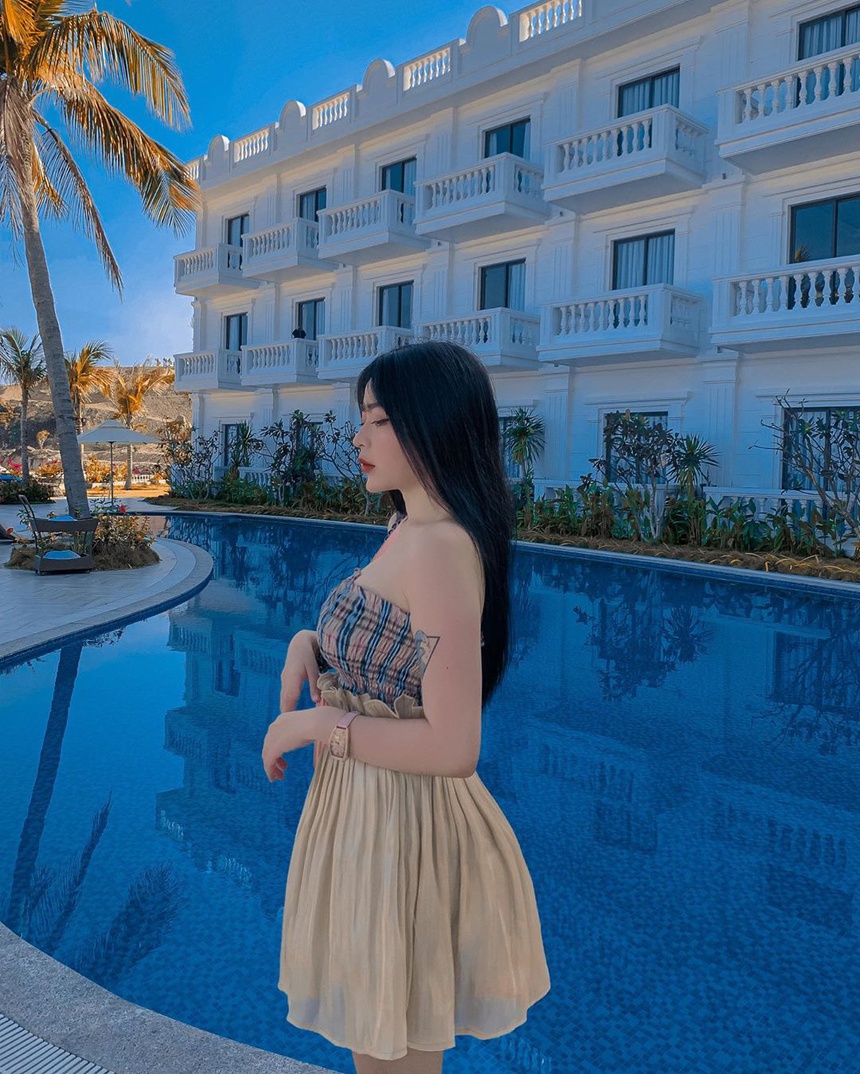 Hà Nguyễn: "thời gian trước là lần đầu mình đến Quy Nhơn và đã nghỉ tại resort này. Mình thích sự riêng tư tại đây, có thể ngắm biển nguyên sơ từ phòng ngủ".