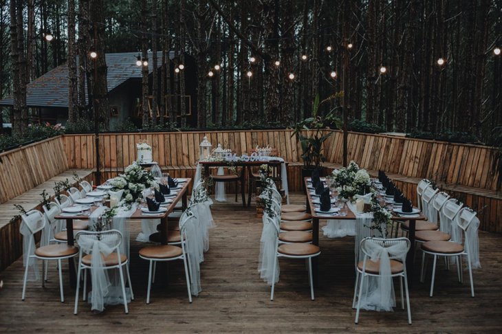 Hàng thông xanh mát bao quanh là nơi rất thích hợp để bạn chọn làm địa điểm tổ chức tiệc cưới. Cách bài trí cũng bắt mắt, khiến bạn vừa nhìn thấy đã thấy lâng lâng.