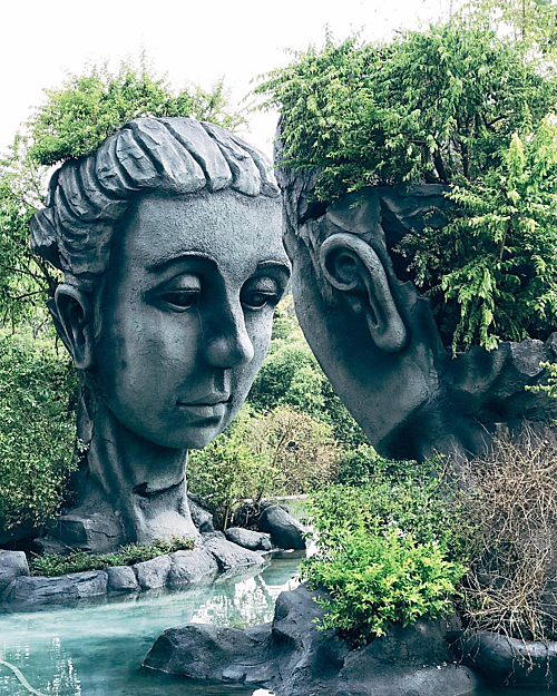 Phía sau đầu tượng là 1 vài tán cây nhỏ, xanh um, tạo được bức tranh nghệ thuật siêu thực. Ở giữa là 1 khe hở cùng một lối đi bằng đá để du khách tha hồ sáng tác những kiểu ảnh sống ảo. Ảnh: t.h.u.t.r.a.n.g