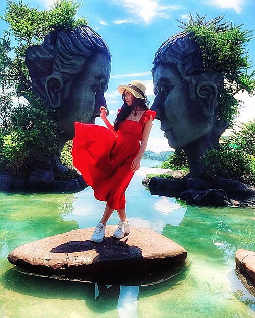 Đặc biệt, giữa hồ có hai bức tượng khổng lồ mô phỏng gương mặt một nam một nữ hướng vào nhau, làm người ta liên tưởng tới chuyện tình chàng K'lang và nàng H'Biang huyền thoại của mảnh đất cao nguyên. Ảnh: titt.b
