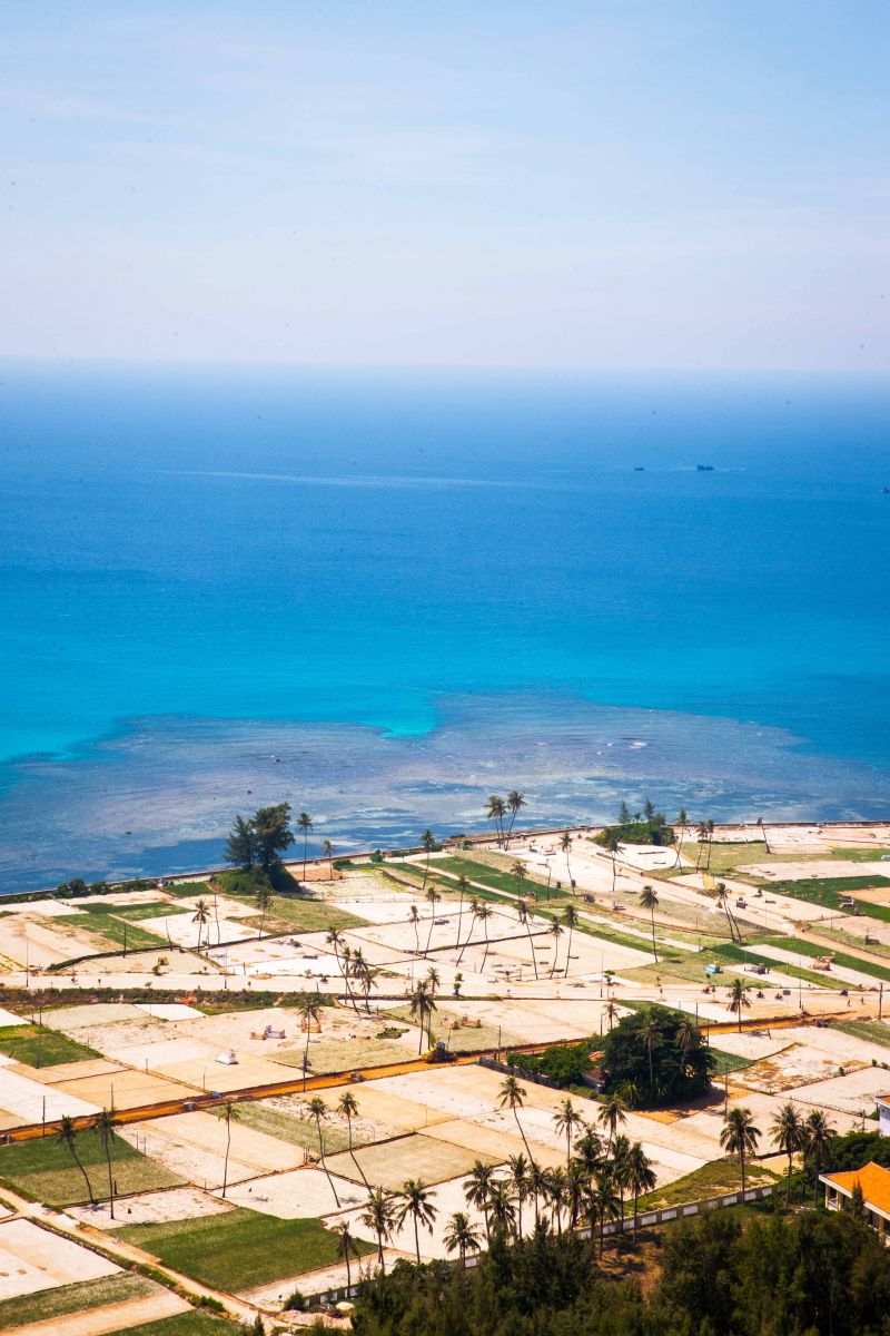 Từ mỏm đá có tên hòn Trâu trên đỉnh núi Thới Lới là cánh đồng hành tỏi Lý Sơn xen lẫn với những ngôi nhà của cư dân trên đảo nổi bật giữa biển trời.