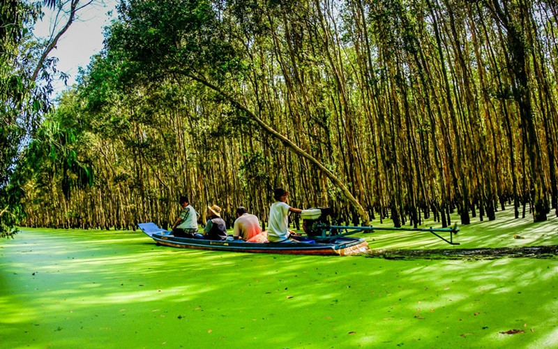 Trải nghiệm tour rừng tràm Trà Sư, khách du lịch chắc chắn sẽ không khỏi xuyến xao trước một không gian xanh mát. Màu xanh của rừng cây, màu xanh của lục bình, của bèo và cả màu xanh của trời đan cài vào nhau đã vẽ nên một bức tranh thiên nhiên đầy bình yên, lãng mạn.
