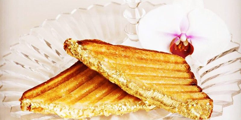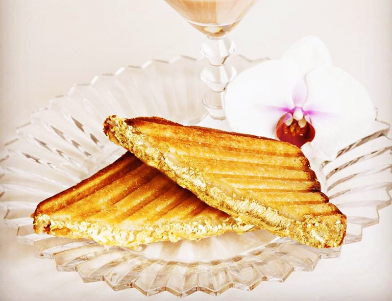 Một trong những món ăn dát vàng ở Dubai được yêu thích chính là món bánh mì kẹp vàng. Nguyên liệu chính bao gồm bánh mì, bơ, nấm Perigord và muối. Bánh mì được lựa chọn vô cùng kỹ lưỡng và là loại hảo hạng nhất nhì thế giới. Nấm Perigord là loại nấm quý, với giá vô cùng đắt đỏ.