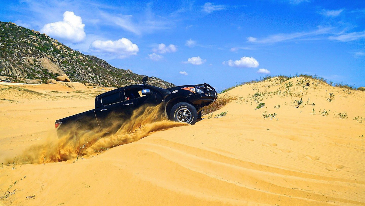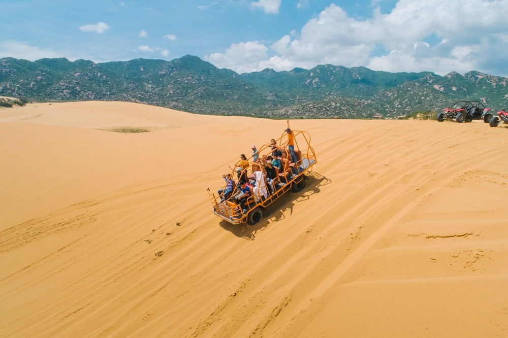 Nếu không giỏi lái moto, bạn có thể cùng những người bạn đồng hành của mình "cưỡi xe bọ" tìm hiểu sa mạc mũi Dinh. Đây là đời xe chuyên dụng dùng để đi trên cát, không có mui, và có sức chứa lên đến 15 người. Chắc chắn trải nghiệm thú vị này sẽ giúp bạn lưu dấu lại những ký ức tươi đẹp của thanh xuân cùng hội đồng du.